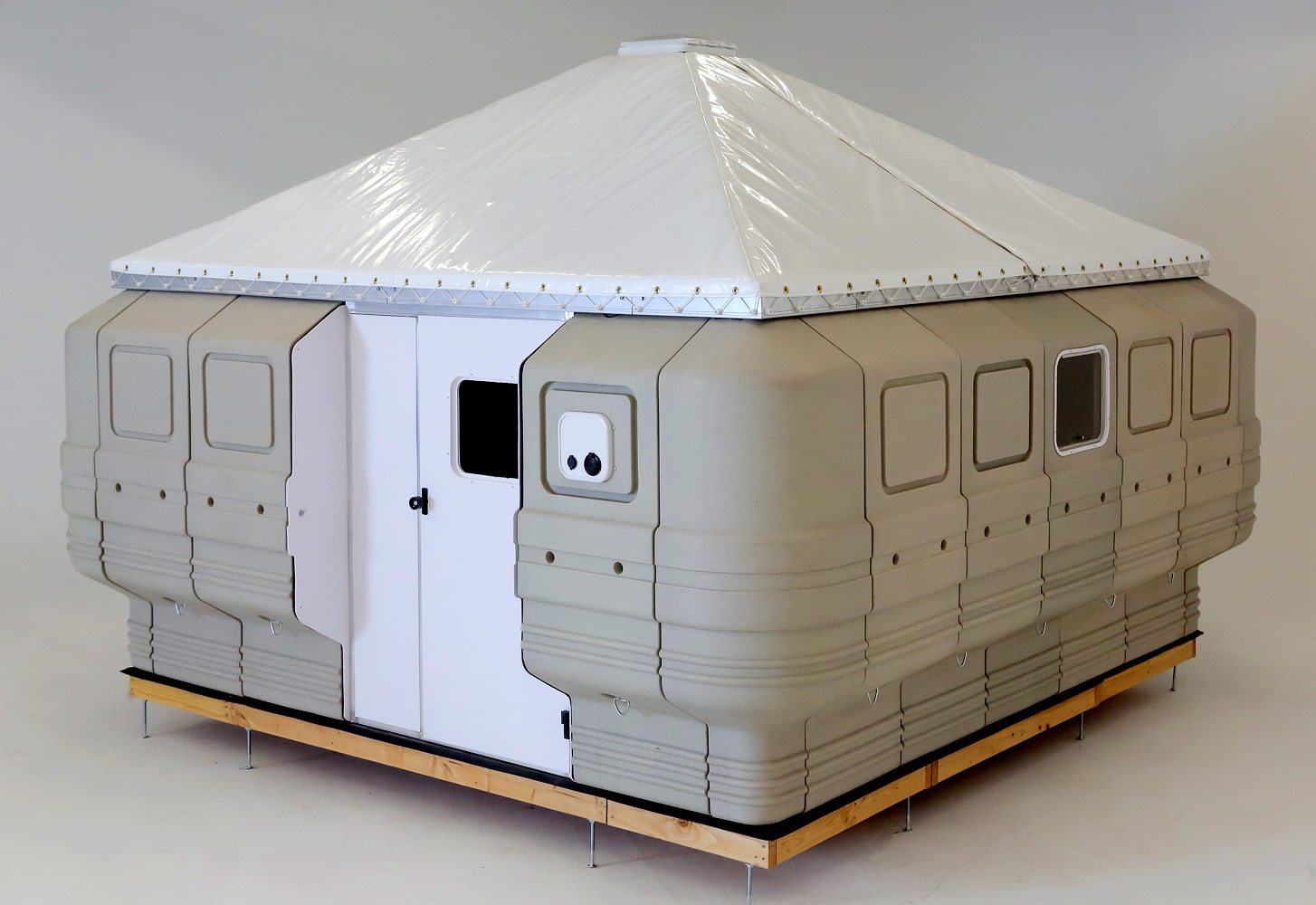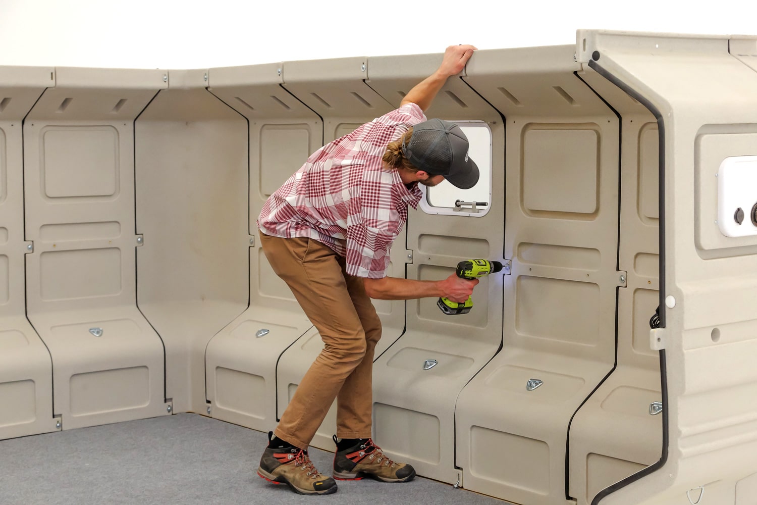 Our panels are rotationally molded from polyethylene, which is known for being highly puncture resistant, very robust, and UV resistant,. We use linear low density polyethylene (LLDPE), as we have found it to have the right mixture of strength and flexibility to guarantee the panels will always fit together and provide a strong, durable shelter for many years. The panels are foam-filled to add strength and insulation. To assemble the shelter, the panels are connected at the top, middle, and bottom with interlocking tabs using simple screws. A water tight edge gasket provides a seal between the panels. Each panel has a sturdy tie down ring on both the inside and outside. There are threaded inserts on the interior wall of each panel, making it a snap to install furnishings. When not in use, the panels nest together for compact storage or shipping.